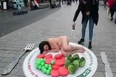 افترشت شابة عارية تماماً الطريق لتبدو وكأنّها داخل طبق طعام في مدينة ليفربول بانجلترا كجزء من إحتجاج ضدّ طهي الديوك الرومية خلال عيد الميلاد.