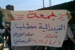 تنادي باسقاط نظام الاسد ومحاكمته ومحاسبة أذنابه ومرتزقته، كما نادات الشعارات بالدعم