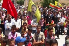 عفرين - خرج المئات من أهالي ناحية شرا في مظاهرة للتنديد بمهاجمة المجموعات المسلحة لقرية معرسكة التابعة للناحية والقرى التابعة لناحية شيراوا ودعماً لوحدات حماية الشعب التي تقوم بالدفاع عن منطقة عفرين ونواحيها وقراها
