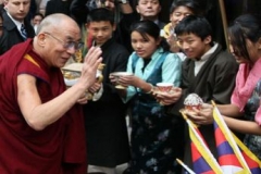 وحيا الدالاي لاما البالغ من العمر 74 عاما المهنئين التيبتيين وتناول الشاي والحليب الذي قدمه له الاطفال.