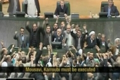 ونقلت وكالة انباء الجمهورية الإسلامية الايرانية عن بيان النواب " (زعيما المعارضة) مهدي كروبي ومير حسين موسوي يفسدان في الارض وينبغي محاكمتهما." وقع على البيان 222 نائبا من بين النواب البالغ عددهم 290 .