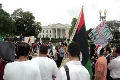 ردد المتظاهرون هتافات بإسقاط النظام، كما عاتبوا إدارة أوباما على موقفها المتردد تجاه النظام السوري